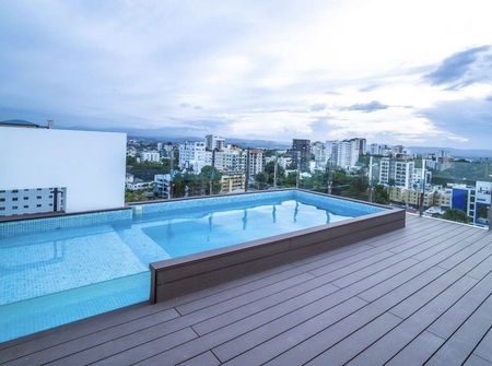 Este exclusivo proyecto tipo Suites, goza de una configuración tipo condo hotel, donde cuenta con un lobby que brinda servicio a los propietarios y huéspedes del proyecto, así como una majestuosa área social con envidiables vistas a la ciudad de Santiago, la misma cuenta con Piscina, Gimnasio y una terraza al aire libre.