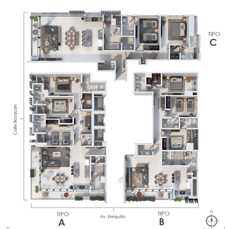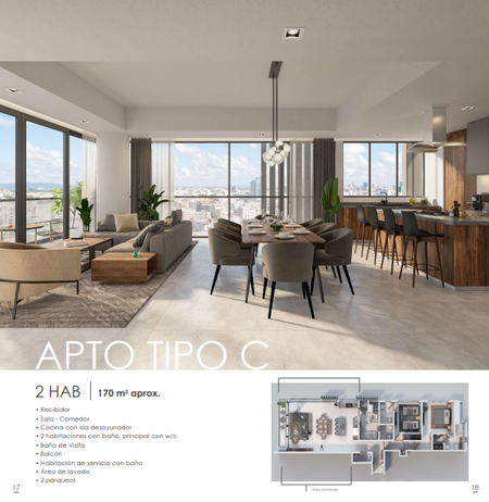 Las unidades de apartamentos están compuestas con opciones de tamaño de 220, 200 y 170 mts2 aprox., de tipología de tres y dos habitaciones.