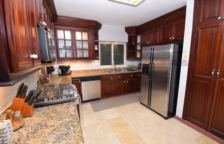 COCINA PANTRY CON TODAS LAS PUERTAS Y JAMBAS EN CAOBA, GRANITO CON FREGADERO EN INOX. ESTUFA DE GAS, LAVADORA DE PLATO, REFRIGERADORA DOBLE PUERTAS CON ICEMAKER.