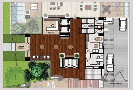 Sofisticada y vanguardista torre que tendrá 18 pisos, con tres apartamentos por nivel (24 en total más un PH) que incluyen terrazas, jardines y áreas sociales propias. En su diseño, a cargo de la firma Pons Arquitectos, destacan el buen manejo de la ventilación en los espacios, el uso de una amplia gama de materiales con diferentes texturas y la incorporación de elementos verdes, con jardines a doble altura en cada apartamento y fachadas vegetales.
