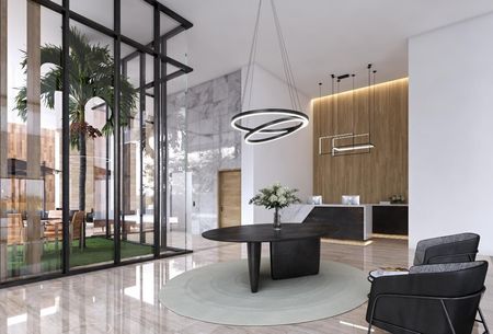 Llegada mediante un lobby compartido con vista a un gran jardín de doble altura.