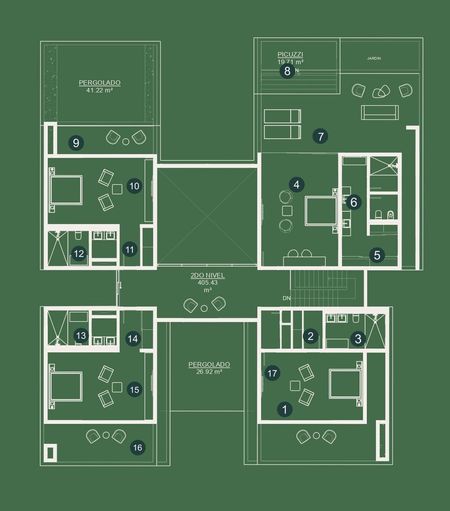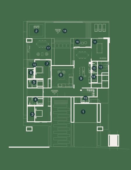 Su diseño contempla dos ejes transversales que se intersectan en la parte central de la villa y que permite una circulación horizontal armoniosa, creando un ambiente armónico entre la vida diurna y nocturna del hogar. Esta propiedad única en su clase presenta seis dormitorios y siete baños que se desarrollan en dos niveles. El primer piso alberga las habitaciones más íntimas de la casa y acoge los espacios de vida principales como cocina, comedor y áreas sociales como áreas de billar, BBQ y piscina. En la segunda planta los ambientes privados se alternan con espacios abiertos comunes, como terraza, picuzzi y balcones.
