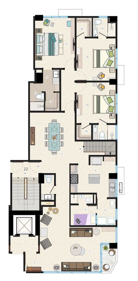 En el marco de su Arquitectura contemporánea y propuesta estética su integración al medio urbano es esencial, brindando a sus Habitantes de espacios amplios y de calidad , con servicios de vanguardia en materia de control y seguridad. El Proyecto distribuido en 9 niveles de apartamentos mas el 1er nivel de ingreso desde el vial hacia el área de Recepción cual está conectado directamente con los módulos circulación vertical. Cada piso constara de 2 apartamento por nivel con un hall común controlado por Token vía el ascensor.
