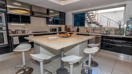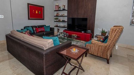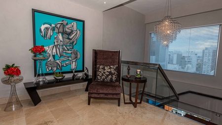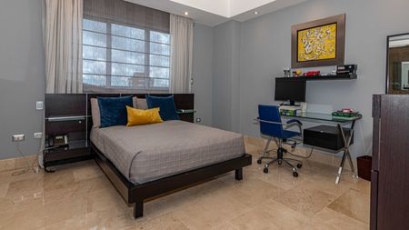 4 habitaciones 4 baños (todos en mármol con inodoros Toto), 2 medios baños, Recibidor, dos salas contiguas, estudio, family, comedor para 16 personas, cocina fría con isla desayunador, cocina caliente, terraza pequeña con sala y comedor, terraza grande para fiestas, 2 lockers, espacio para oficina (usado para neveras de vinos, cava), área de lavado, cuarto de servicio con su baño. 5 parqueos, 2 lockers, ascensor llega a ambos pisos (ósea que uno puede llegar directamente al piso de las habitaciones o del área social, importante si hay algún impedimento físico para subir escaleras)