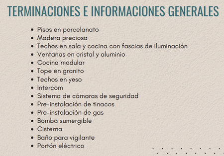 Terminaciones en : Pisos en porcelanato, fascias en sala y cocina, cocina modular, topes de granito, sistema de cámara de seguridad, bomba sumergible, cisterna
