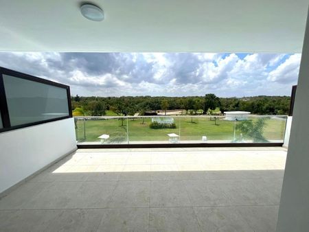 Amplia terraza con vista a la piscina y campo de golf