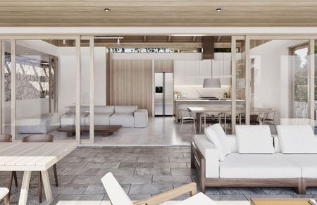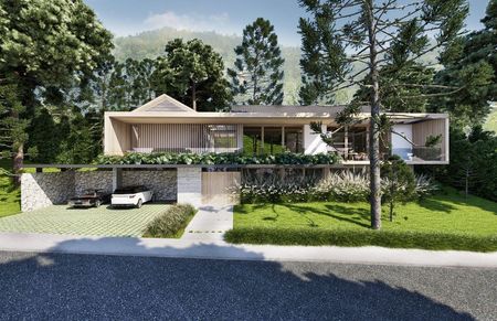 -Revestimiento exteriores en madera pañete blanco corrugado y concreto visto.