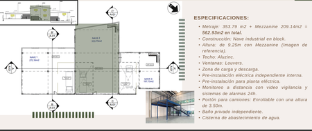 NAVE 2: Superficie: 353.79 m² + Mezzanine: 209.14 m² = Total: 562.93 m²
