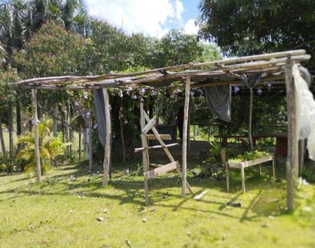 Gazebo de hormigón, gazebo de cana, granja, pozo de agua, estructura hidráulica .