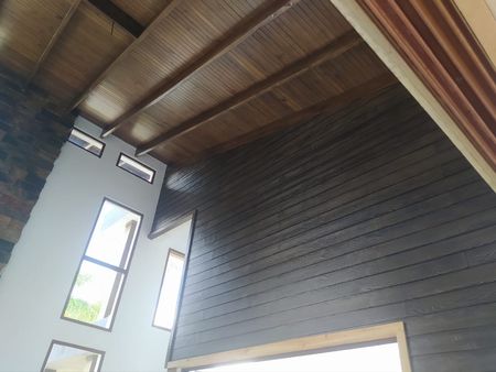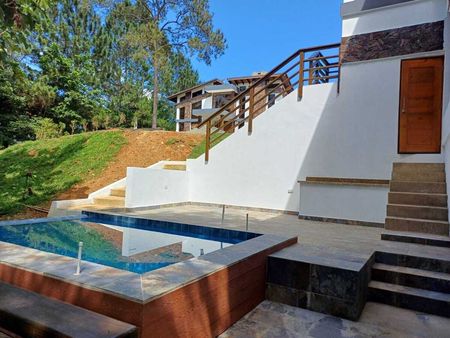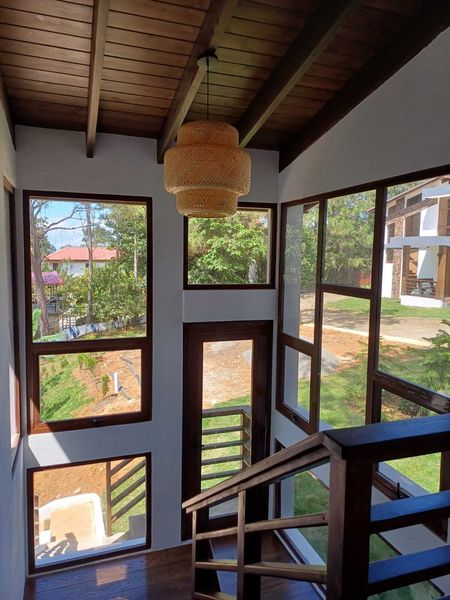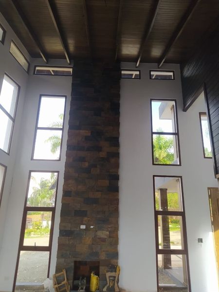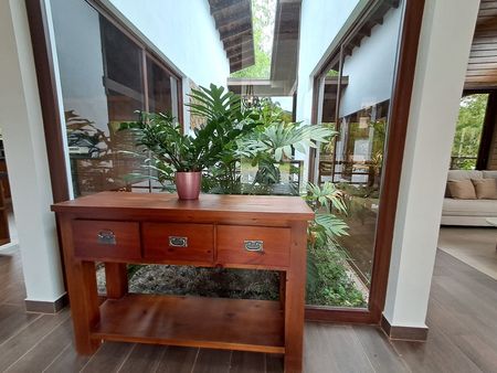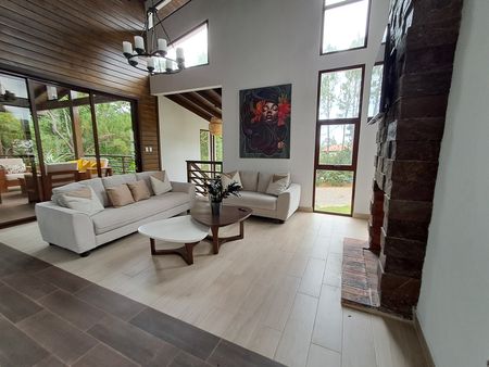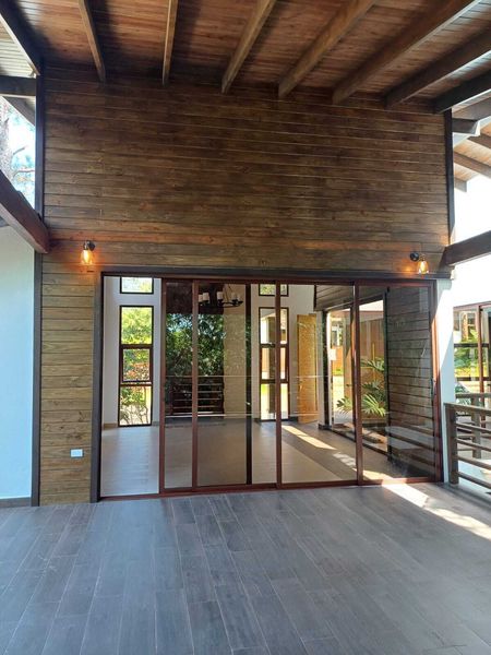 Techos de doble altura, diseño moderno con espacios integrados, disfruta de la naturaleza en un paraíso natural Terminación de primera calidad. En el primer nivel tiene jardín frontal, marquesina, puerta de dos y doble altura,recibidor, sala con chimenea, Terraza amplia en forma de L y hermosa vista al patio rodeada de Bambus, comedor, cocina y patio interior con vista al centro de la casa completa.