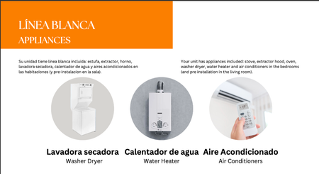 - linea blanca incluye: horno, estufa, extractor, lavadora secadora, calentador de agua, aires acondicionados en las habitaciones (y pre-instalacion en la sala)