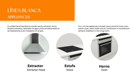 -Linea blanca incluida: horno, estufa, extractor, lavadora secadora, calentador de agua, aires acondicionados en las habitaciones (y pre-instalacion en la sala).