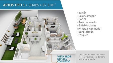 balcón, sala-comedor, cocina, área de lavado, 3 habitaciones, habitación principal con baño, baño común y parqueo.